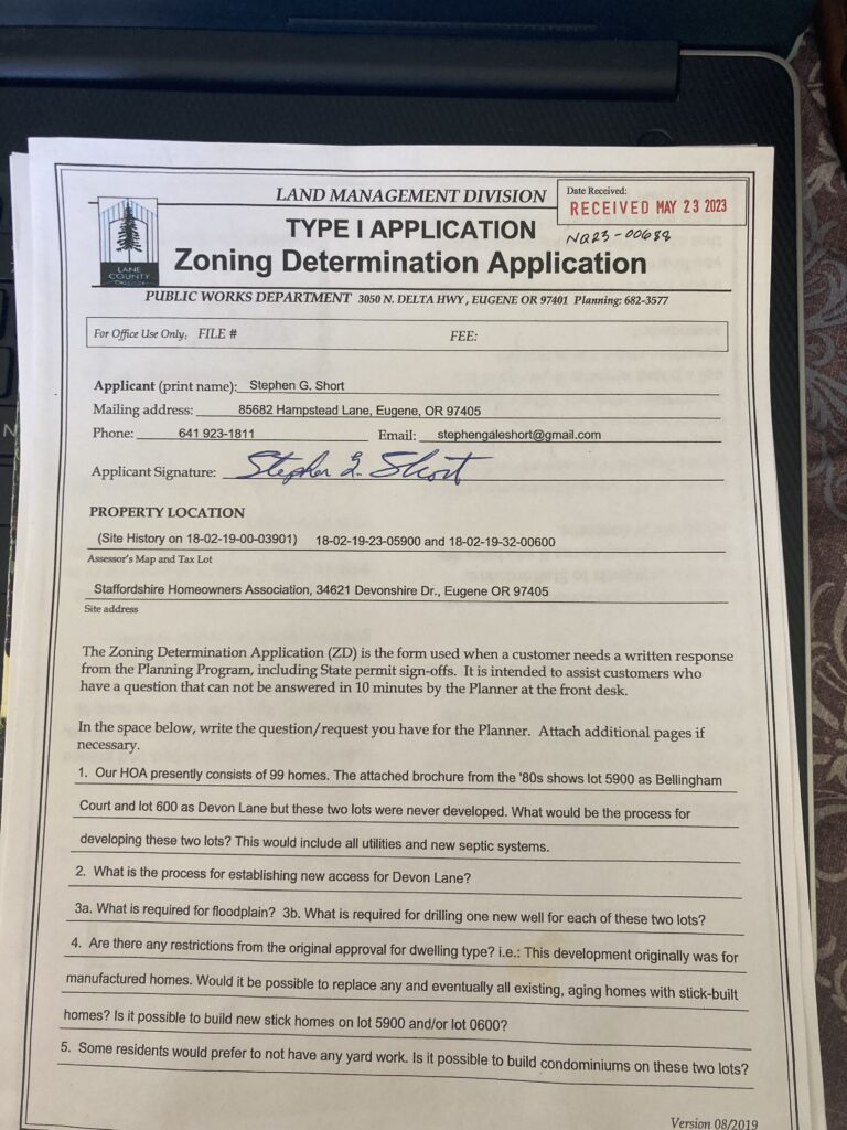 Below is the official response I received from the Lane County Land Management Division. This document seemed very thorough and confusing at the time I received it. I asked one of my attorneys to “translate” this document into layman’s terms. If the Staffordshire Homeowners Association membership is truly interested in learning more about the possible development of Staffordshire, please let me know. The information I received from my attorney was costly, and it makes no sense for me to share his “translation” with anyone until I am certain there is genuine interest from the community. I am certainly willing to share more information, but I need to be sure that the governance of our HOA is truthful, transparent, and trustworthy. I still have hope!